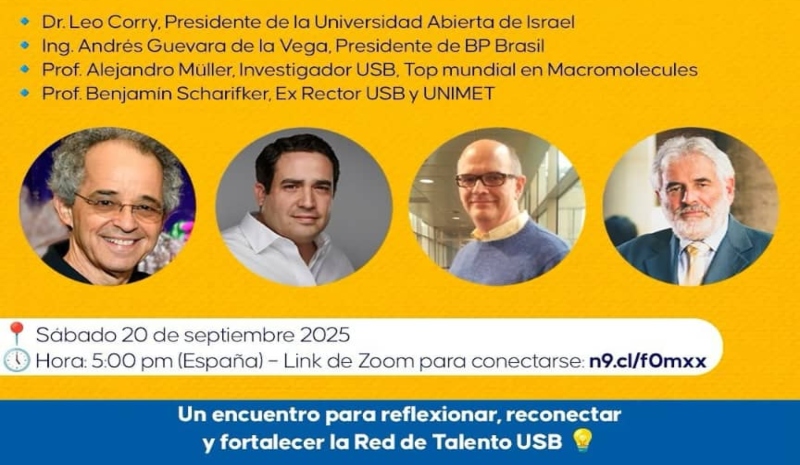 Con el propósito de compartir sus experiencias e invitar a los egresados a participar en el “Proyecto Red de Talento USB” participarán el Prof. Emérito, Dr. Leo Corry, presidente de la Universidad Abierta de Israel, vía videoconferencia; el Ing. Andrés Guevara de la Vega, presidente de Brithish Petroleum Brasil, vía videoconferencia y el Prof. Emérito, Alejandro Müller, investigador USB, Primer Lugar en el ranking de los Mejores Científicos Macromoleculares, en forma presencial.
