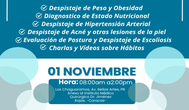 Cita: Sábado 1 de noviembre. Hora: 8:00 a.m. a 2:00 p.m. Lugar: Clínica Dr. Jiménez Rojas, Los Chaguaramos (a una cuadra del Metro Ciudad Universitaria).