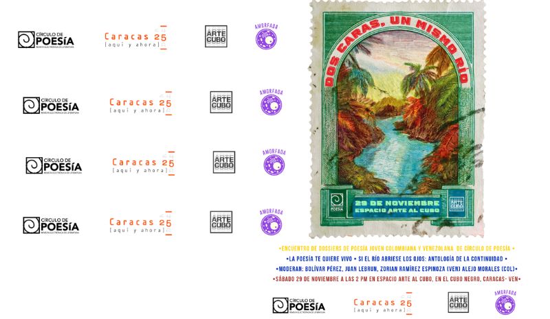 El próximo sábado 29 de noviembre, de 2:00 a 3:30 p.m, la galería Espacio Arte Al Cubo (Cubo Negro, Chuao) será el escenario del encuentro literario “Dos caras, un mismo río: encuentro de dossiers de poesía joven colombiana y venezolana”, organizado por la plataforma internacional Círculo de Poesía, en el que se reunirán a los compiladores junto a poetas de ambas naciones para leer sus trabajos y conversar sobre los rumbos de la lírica contemporánea, en el marco de la exposición de arte joven “Caracas aquí y ahora”.