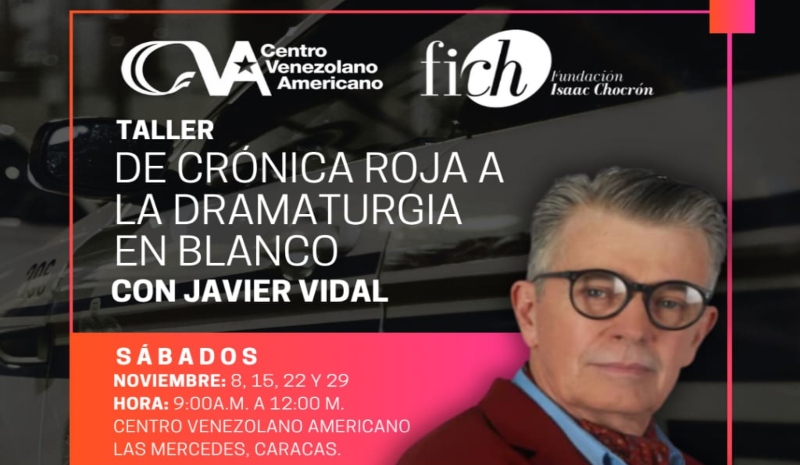 Se inició el proceso de incripciones para el taller “De crónica roja a la dramaturgia en blanco”, que será dictado por el actor, director y dramaturgo venezolano Javier Vidal durante cuatro sábados, a partir del 8 de noviembre de 2025, en la Sala Margot Boulton de Bottome del CVA Las Mercedes, en el marco de la alianza entre la Fundación Isaac Chocrón y el Centro Venezolano Americano.